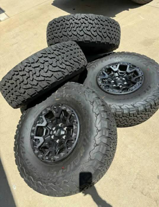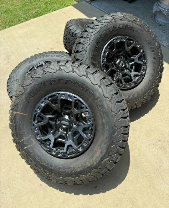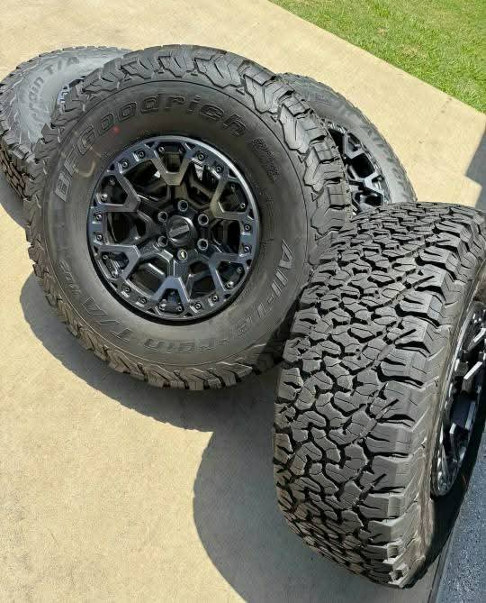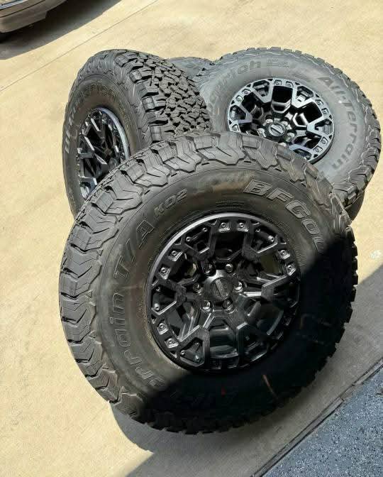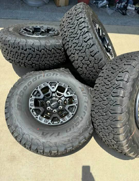 Set of 4 tires and wheels for 2025 Ford Raptor. Only driven a 100 miles. Vehicle: 2025 Ford Raptor Wheel size: 17" Lugs: included Tire type: BFGoodrich All Terrain KO2 Tire size: 37x12.50R17LT Tread depth: 15/32 100%
